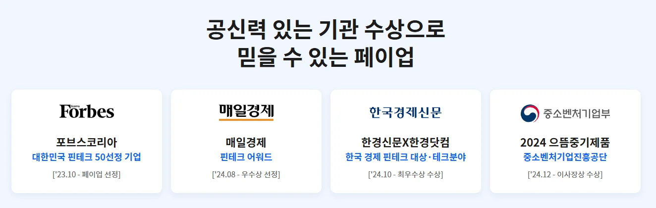 또한 전자금융업 정식 등록된 인증 업체라는 점과 포브스 코리아·한경 테크 최우수상 등 다양한 수상 경력이 있기에 믿고 선택하였습니다.