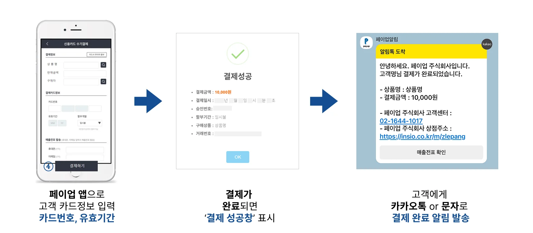 문자결제: 고객에게 문자 메시지로 결제 링크 전송 → 고객이 링크를 눌러 결제 진행